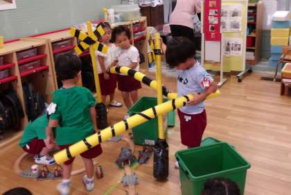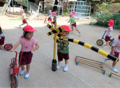 先生と一緒につくった遮断機と警報機を組み合わせると、なんと踏切ができあがりました。「カンカンカン♪」と言いながら、おもちゃの電車を動かしています。園庭に持って行いくと、スケーターに乗った子どもたちが集まってきました。「カンカンカン♪〜」楽しそうでした。