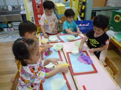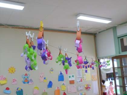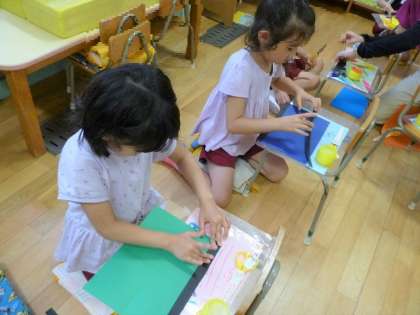 みどり組は、七夕の飾りをつくった時の技法をいかして提灯づくりをしていました。使う紙は折り紙から画用紙にかわり、つくる提灯も大きいです。「お部屋にいっぱい飾ったらもっともっと楽しくなるよ」とできあがりの色を考えながらつくっていました。