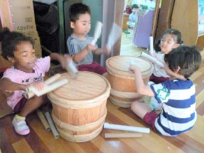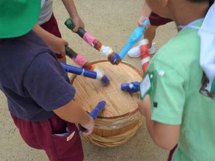 夏から秋にかけて地域のいろいろなお祭りに出掛けた子どもが多く、先生と樽を見つけると太鼓に見立てて打つことを楽しんでいます。