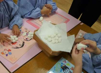 子どもたちはお月さまに見てもらおうと心を込めてお月見だんごをつくりました。