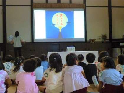 お月見や仲秋の名月の由来の話を聞き、スクリーンで「おつきみうさぎ」の物語を観賞しました。