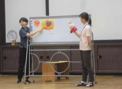 食欲の秋、先生やマスコットのあいちゃんが旬の食べ物を紹介してくれました。幼稚園で栽培しているサツマイモももうすぐ収穫ですね。