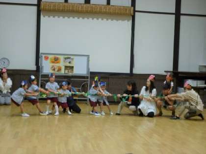 誕生会では、誕生児が一足先に芋掘りに挑戦!長いツルを「うんとこしょ!どっこいしょ!」と力を合わせて引っ張って土の中のイモと力比べ。見事たくさんのおイモが出てきました。子どもたちの力はすごい!