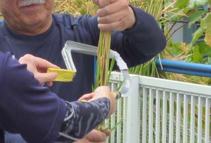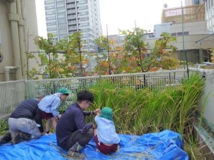 今週、もも組・みどり組は稲刈りをしました。場所は向かいの緒方ビルの屋上です。