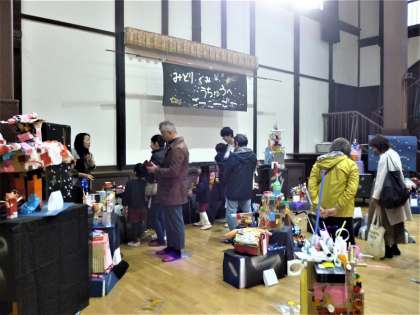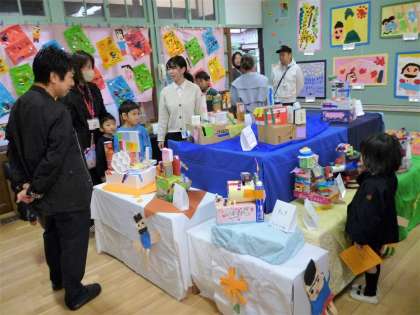 自分で「ここをくっつけるのが難しかってん」「こんなことをかいたよ」と苦労したり工夫したりしたこと、イメージしたことなどを自分なりに一生懸命に説明していました。友達の作品についても説明している子どもがたくさんいました。先生たちは、つくったりかいたりしている過程で、友達同士で見せ合ったり話し合ったりする時間を多く設けているので子ども同士、友達のがんばりもよく知っています。