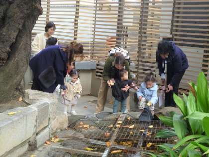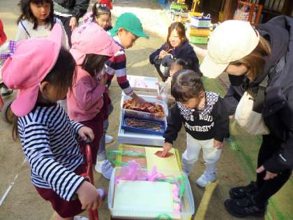 11月のあいあいらんどでは、週末に開催した「こどもたんらんかい」を見ていただいたり、木の実や枝、落ち葉など園児がいつも親しんでいる秋の自然物にふれてったもらったりしました。小さい友達が思わず触ってしまいそうになるくらい興味のある作品ばかりだったようです。保護者の方は「一生懸命つくっているのが分かります。こんなこともできるようになるんですね」と、一つ一つ心がこもった作品に感動と感心をされていました。