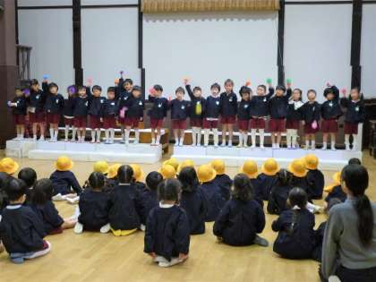 あか組もも組の友達にも沢山のお客様の前で披露した歌を聴かせてくれました。優しい歌声、明るい歌声と手遊び!曲によって歌声が変わります。小さい組の友達はコンサートのお客さん、素敵な歌声に沢山の拍手を送っていました。