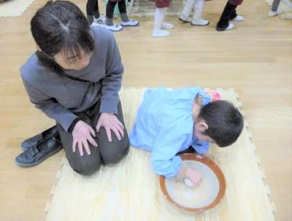 うまく籾が外れたと思ってもよく見るとまだ稲穂のように連なったままのものもあります。見つけると丁寧に一粒ずつ外していました。「腕疲れるー!」と言いながらも、籾が外れるようにすり鉢にボールを擦り付け、グルグルゴロゴロ頑張っていました。