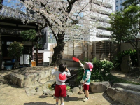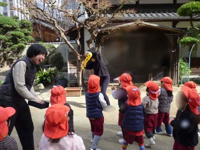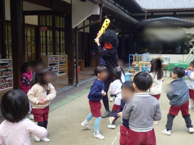 2月3日は節分。子どもたちは、つくった三方に豆を入れ、鬼が来ないように「鬼はそと!鬼はそと!」園庭で豆まきを始めました。突然、ドンドンドンドンドン!と太鼓の音が聞こえて幼稚園に鬼が現れました。怖そうな顔、金棒も持っています。「弱い子どもはいないか~」と向かってきます。 子どもたちは驚きましたが、勇気を振り絞って大きな声で「鬼はそと!鬼はそと!」と鬼に向かって豆をまき続けました。すると鬼は…「参った参った」と降参。。。鬼も強い心の子どもたちにはかないません。 寒い日が続いていますが暦ではもう立春を迎えています。古くからの伝統行事に親しんだ日、頼もしい子どもたちの姿が見られました。