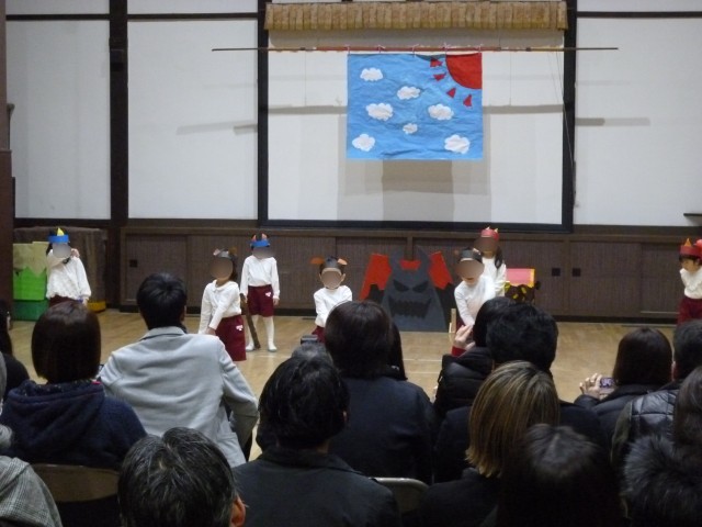 ・日本の昔話に興味をもち、先生と一緒にいろいろな絵本作家の「ももたろう」の絵本に親しんできました。ももたろうのお話に親しむにつれて「きびだんごつくろう」「鬼さんはこんな顔してるよ」と必要な物をつったり、登場人物の表情まで考えたりしていましたあ。鬼ヶ島への道中のオリジナルの歌もかわいかったです。表情、セリフなどそれぞれの登場人物になりきって楽しんでいました。