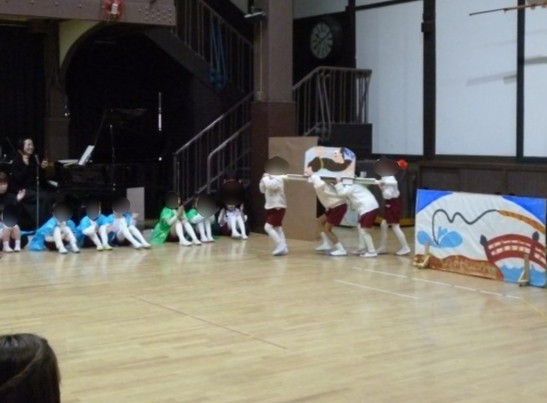 ・いつも、みどり組の子どもたちが行くところ行くところで「あんたそこでなにしてるのや」「へえ、わては●●してますねん」と、コテコテの大阪弁が聞こえてきます。どっぷりととらやんの世界に入り込んでいる子どもたち。劇では、気のいいとらやんが釣ったウナギを探す道中で次々に出会った人たちの手伝いしていきますが、場面がどんどん変わり、何が起こるのか最後まで目が離せませんでした。場面転換はテンポよく自分たちで!替え歌や身体表現が満載!コテコテの大阪弁が飛び交って笑いいっぱい!!子どもたちのチームワークはばっちりです。お客さんたちはでユーモラスでどんどん話が展開していく「てんまのとらやん」に夢中でした。