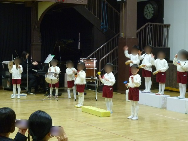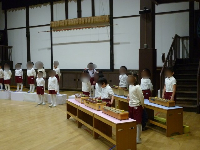 ・せいかつはっぴょうかい最後のプログラムでした。合奏では、親しんで演奏してきた楽器が一堂に集まりました。これまで、保育室でも廊下でも「ガボット」に合わせてそれぞれの楽器を演奏してきた子どもたち、メロディーや曲想は一人一人の心の中で刻まれています。どの楽器をどのフレーズで演奏しようか・・・演奏する楽器や演奏の仕方、ベルや木琴などは「合う音」を探してきました。当日の合奏は2回、どの子どもも楽器を交代して演奏しました。「パレード」の歌は明るく元気なみどり組の子どもたちにぴったりの歌です。声の出し方、歌い方、姿勢など工夫してきました。弾む歌声が会場に響き渡りました。