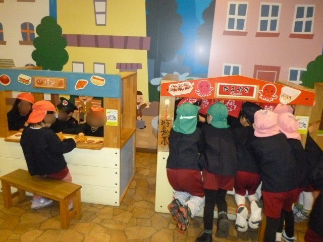 5階では、いろいろな国の文化に触れる遊び、科学や不思議実験など見渡す限り興味のあるものばかり。目を輝かせ、いろいろなコーナーで遊びました。沢山遊んでお腹はペコペコ、昼食の時間も全クラス一緒にいただきました。終始、楽しくふれあいいっぱいのおわかれ園外保育でした。