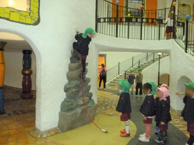 2月16日、みんなでおわかれ園外保育に出掛けました。優しく大好きなみどり組のお兄さん・お姉さんと一緒に行く最後の園外保育でした。北浜駅から2駅、早めに集合して出発したのでキッズプラザに一番に到着しました。開館からお弁当の時間まで存分に館内で遊ぶことができました。キッズマートやお店屋さんコーナーでは買いたいものを選んで自分でレジへ、。バーコードをかざしてお買い物は完璧。店の人とお客さんになってやり取りふれあいも楽しんでいました。お城の中は迷路のようで、階段や梯子、ロープやボルタリングのように坂道を上って移動していました。