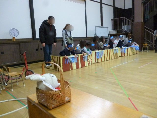 2月の誕生児はなんと8人!一番小さい組のあか組には5人の誕生児がいましたが、自分の名前や年齢もしっかり自分で言うことができました。誕生児へのプレゼントは、あか組からいろいろな色の手袋の飾りがついた冠でした。寒い時にはあたたかい手袋がいいですね。