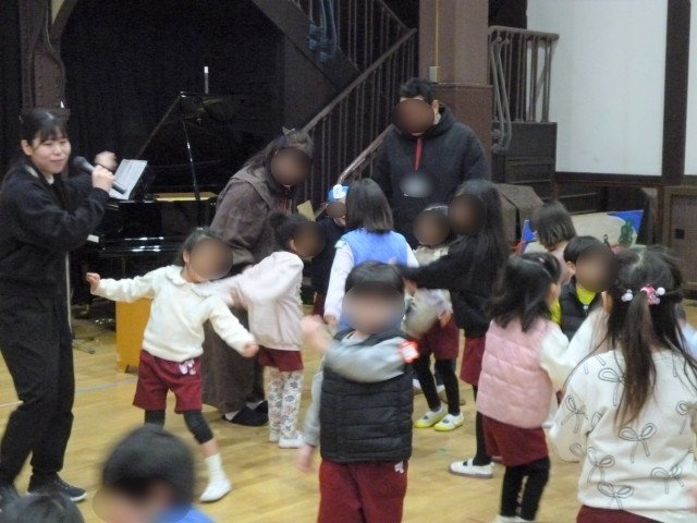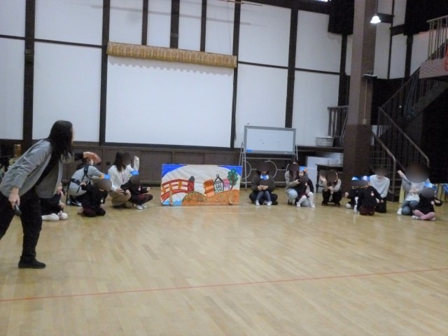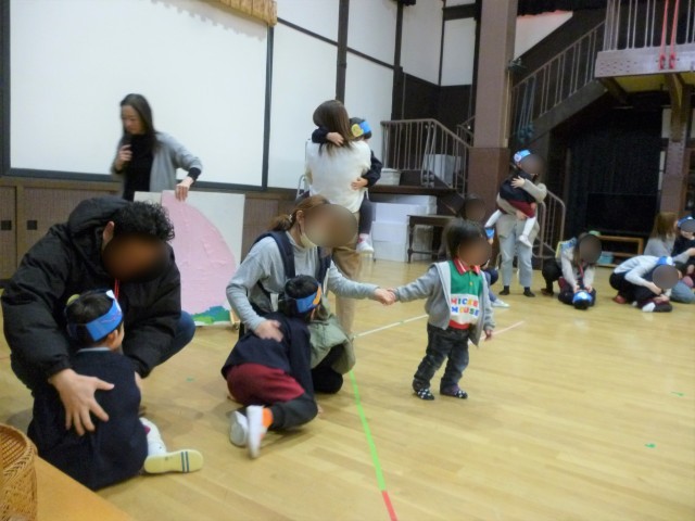 楽しかった先日のせいかつはっぴょうかいの遊びが続いているので、誕生会の中でも誕生児とおうちの方が楽しみました。「もりのおふろ」に入り、大事に育てられた「ももたろう」は天満に行き、天満ではとらやんがウナギ釣り!ショートカットで3クラスの劇遊びを一挙に楽しみました。会の最後はこの時期にぴったりの「温泉はいろっか♪」のダンスをしてみんなでポカポカあたたまりました。今月も楽しい誕生会でした。