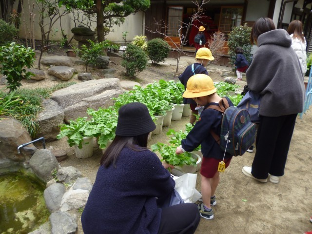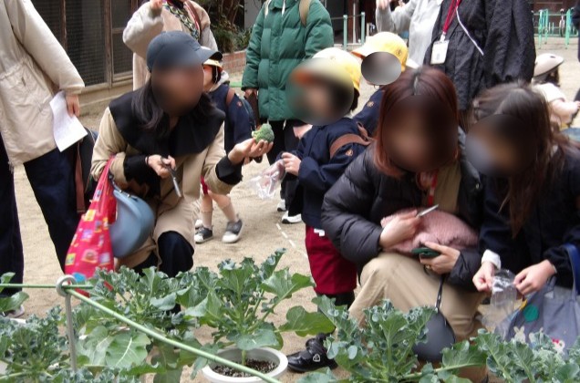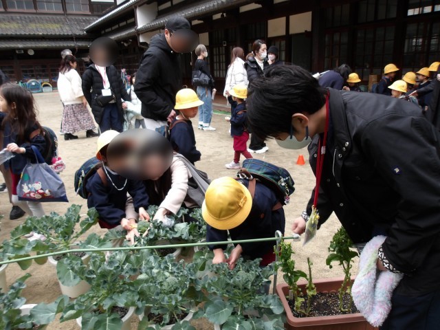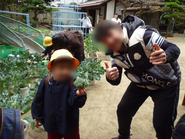 あか組、もも組では「赤ちゃんブロッコリーが大きくなった!」「明日お弁当に入れてもらうねん」と、おうちの人と一緒にブロッコリーを収穫しました。