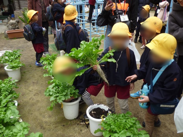 みどり組はてんまのとらやんのように、大根を力強く引き抜きました。周りの友達やおうちの人に応援してもらいおいしそうな大根が出てきたときには嬉しさでいっぱいの様子でした。自分たちで大切に育てた野菜、どんな味がするのか楽しみですね。