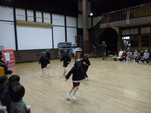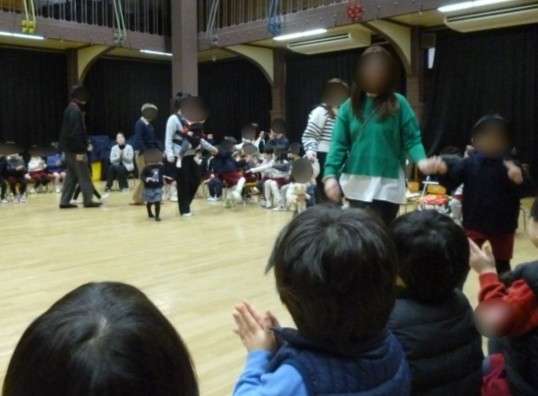 1年間の子どもたちの成長を祝って「お誕生月なかま」の遊びもしました。歌詞に合わせて4月から順に誕生児が登場してみんなの周りをスキップ!3月生まれの友達も元気いっぱいでした。みんな大きくなりました。お誕生日おめでとう!