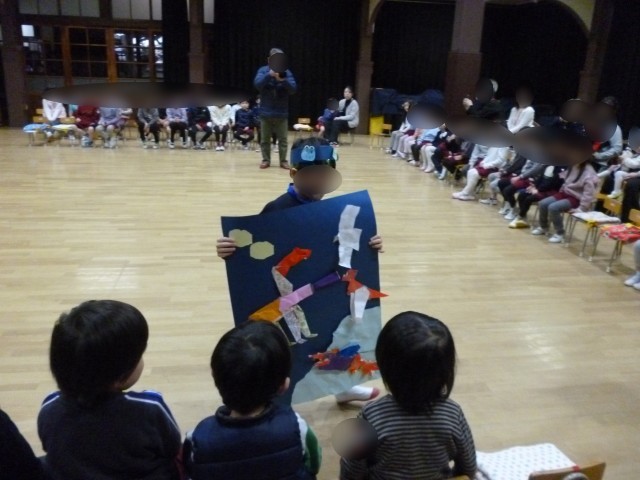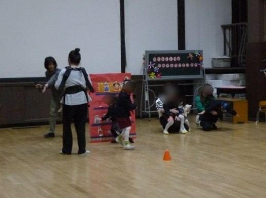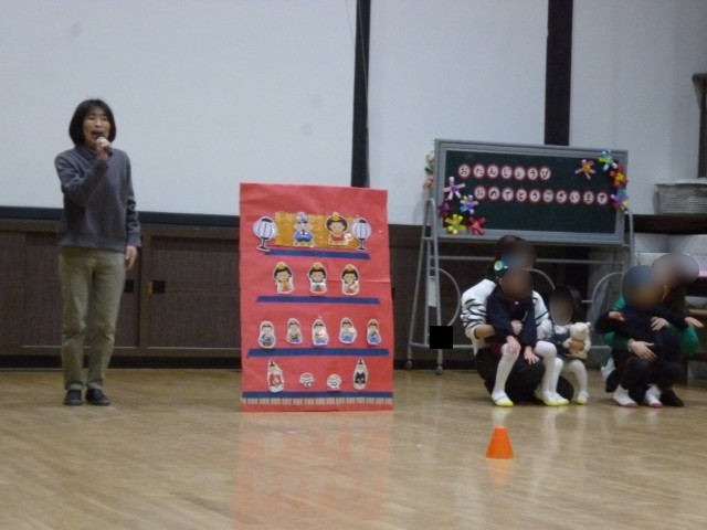 この日は丁度「ひなまつり」、ひなまつりにちなんだ遊びも楽しみました。「あれ?ひな飾りに何か足らないね・・・」と司会の先生が困っていると、誕生児と保護者の方が三人官女に扇やぼんぼり、ひしもちと、迷子になっていたものを探して飾って、かわいいひな飾りが完成しました。