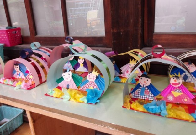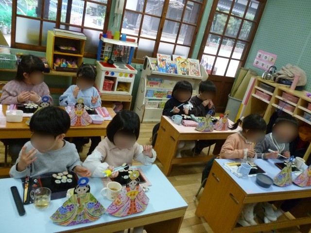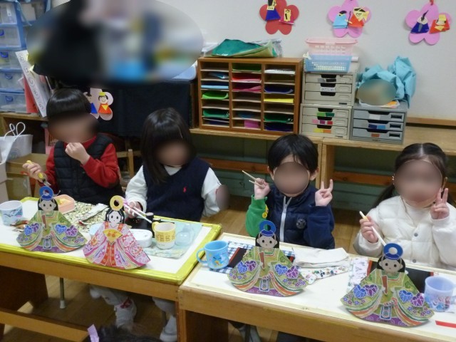幼稚園の雛人形はとても古くからあります。1年のこの時期だけですが、おうちの方とゆっくり眺めたり、間近で見たりしていました。自分のお気に入りのひな人形もつくりました。お家でも飾ったことでしょうね。