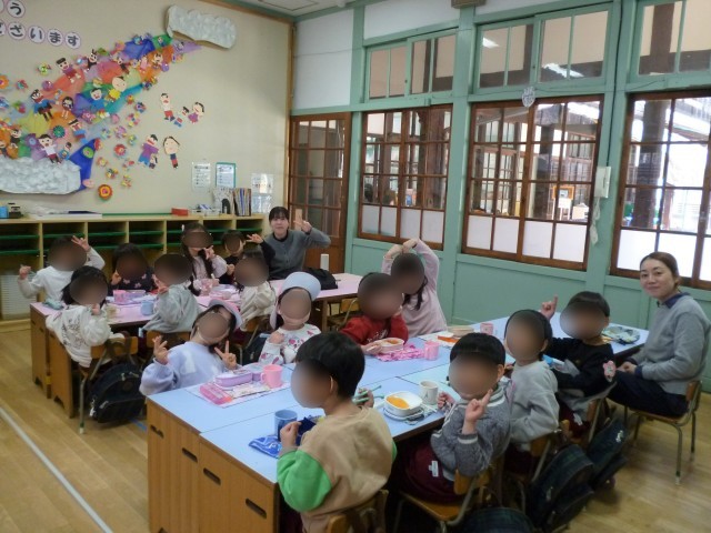 あか組の子どもたちはもも組の保育室で、もも組の子どもたちはみどり組の保育室でのお弁当です。進級した気分になり、嬉しくて嬉しくて仕方がないようす、憧れていた一つ大きい組の保育室でお弁当を食べ、すっかりお兄さんお姉さん気分の子どもたちでした。