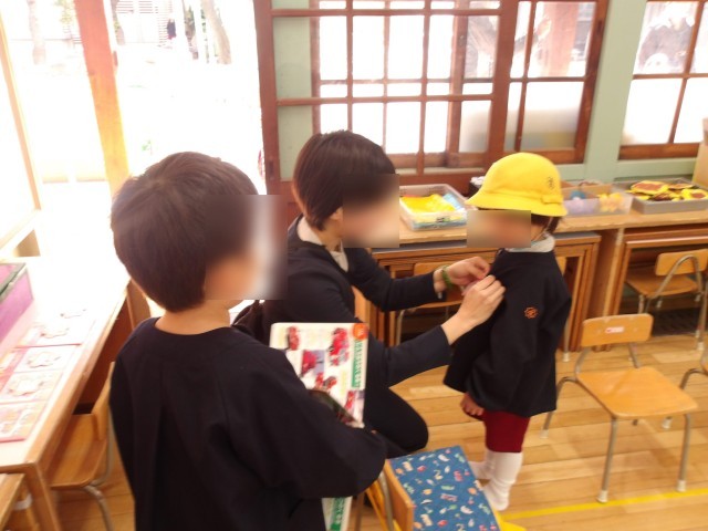 進級し、ひとつ大きい組になった子どもたちは、先生に新しい名札をつけてもらい喜びいっぱい!