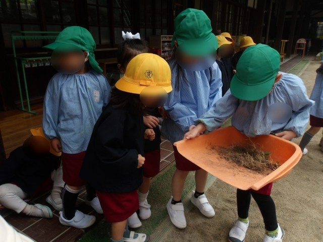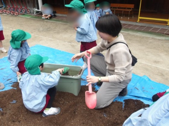 今週、みどり組の子どもたちがジャガイモの種芋を植えました。根っこを取り除き、土の中にいる虫にも興味をもちながら、プランターに土を入れ、自分たちで土づくりもしました。掘った土の中に、小さな種芋をそっと入れ、土をかぶせていました。友達と力を合わせてプランターを運び、日当たりの良い北門の坂道に並べました。「大きくなりますように」「おいしいジャガイモになーれ」と生長への期待でいっぱいの子どもたち。すくすくと育っていきますように。