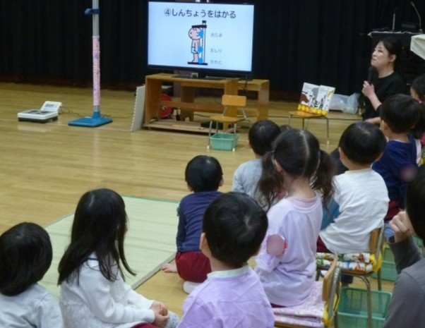 4月17日、あか組は初めての発育測定をしました。子どもたちは、何するのかな??と思っていましたが養護教諭の先生からスライドを見せてもらい、みどり組のお兄さんお姉さんが一人ずつ丁寧に着替えを手伝ってくれました。スライドも先生の話も分かりやすく、優しいみどり組にも囲まれてとっても安心!誰も泣くことなく発育測定を受けることができました。着替え終わったあともみどり組さんが一緒に絵本を読んでくれました。初めての発育測定は大成功でした。
