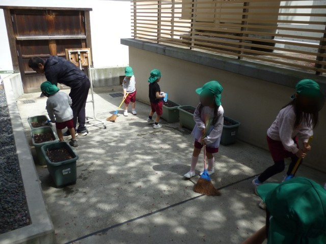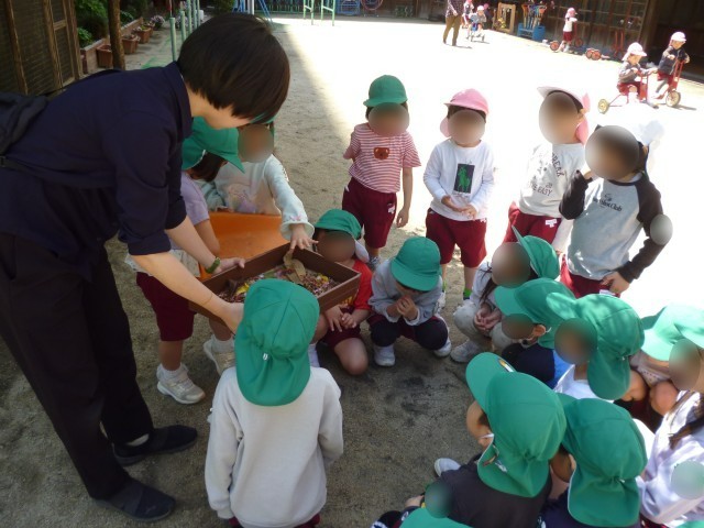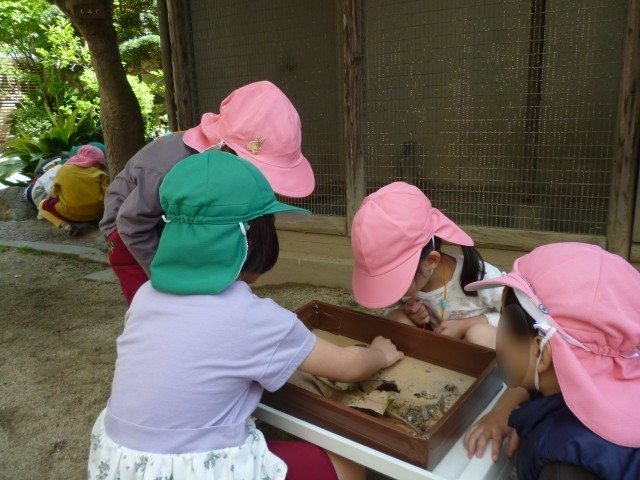 ダンゴムシ探しが盛んになるにつれ、「もぐったっり、かくれたりする場所がいるよね」とサクラのガクを集めてダンゴムシのフワフワベットをつくっています。