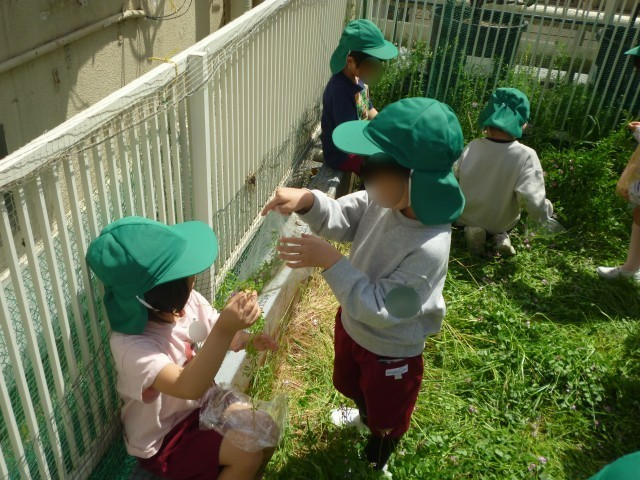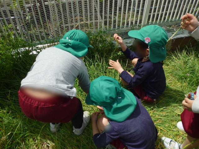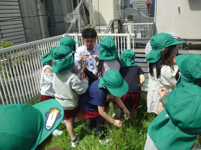 屋上の田んぼには、昨年のみどり組が種まきをしてくれたレンゲが花を咲かせていました。レンゲの他にもスズメノテッポウもいっぱいありました。地域の川上様や先生から、レンゲのネックレス作りや草笛の遊び方など教えてもらい、見つけた草花を大事に摘んで遊びに使っていました。