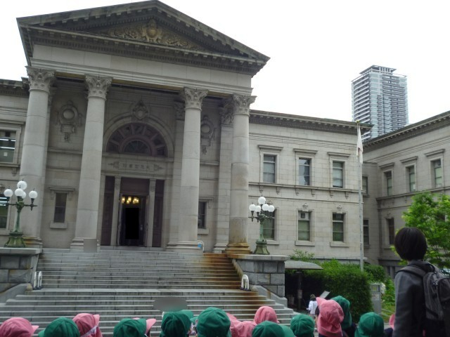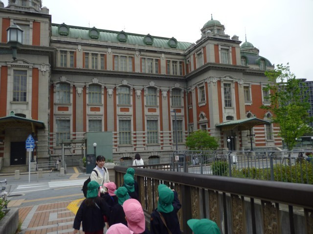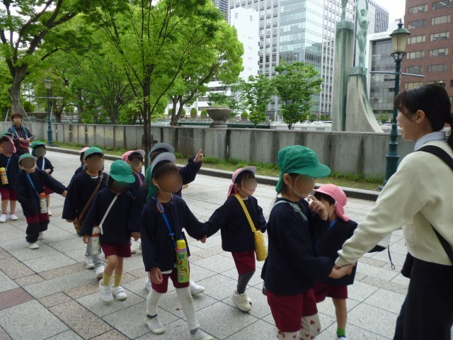 庁舎の1階をぐるりとまわり、東玄関から外に出ると、目の前には大阪市立中央図書館が見えます。「中央公会堂と形が似てるね」「行ったことあるよ」「行ってみたい」など、いろいろな声があがりました。おさんぽデ-はしっかり歩きながら地域散策を楽しめる機会です。おさんぽに行く場所は日頃からよく通る生活圏が多いですが、改めてじっくりと見て、歩くことでどの子どもにも地域への親しみの気持ちは増したことでしょう。感動し、気付きや発見を楽しんだおさんぽデ-でした。