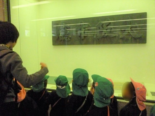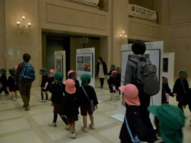 大理石でつくられた高い天井のロビーの美しさと広さに「うわぁ!」と感動し、シャンデリアや螺旋階段も発見しました。丁度この期間に展示されていた高校生の絵画を見ってまわり、ガラスケースに入った諸外国からの贈呈品、「大阪市庁」と彫られた石碑など、珍しいものばかりでした。「これ何?!」と目を輝かせ、先生に質問がいっぱいとんできました。