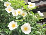 ナニワノイバラが白くて大きな一重の花を咲かせています。暖かい日が続き今満開です。