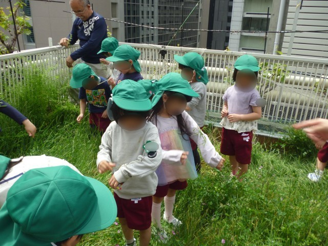 4月17日、みどり組は向かいの緒方ビルへレンゲ摘みに出かけました。屋上の田んぼに...