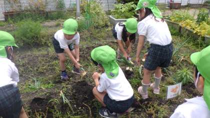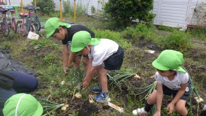 5歳児のもり組さんが畑のタマネギを収穫しました。