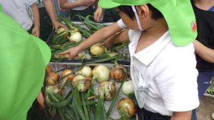 また、収穫した玉ねぎを4歳児のはな組さんに見せに行きました。はな組さんに、「ほら、見て見て」「匂ってごらん」と、声をかけ、はな組さんも土のついた採れたてのタマネギに興味津々な様子でした。