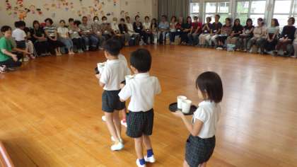 遊戯室では、子どもたちがおじいちゃんやおばあちゃんに「100さいのうた」のプレゼントをしたり、年長さんがお茶をお盆にのせておじいちゃんやおばあちゃんに渡したりしました。