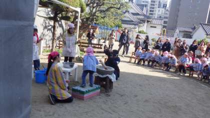 「よいしょー!よいしょー!」と、みんなの元気なかけ声に合わせておもちをつきましたよ。