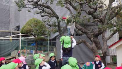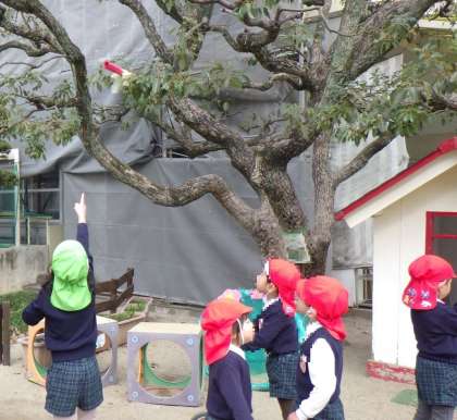 今日も元気に遊んでいると…。5歳児もり組さんのお友だちが木に引っかかっている何かを見つけました!木の枝の高い所に何かが引っかかっていたのです。