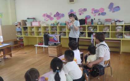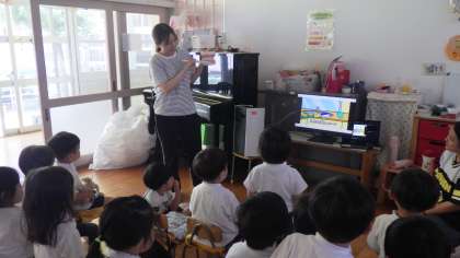6/4〜6/10の「歯と口の健康習慣」に合わせて、もも組・はな組に歯磨き指導をしました。虫歯になると、歯が黒くなるだけでなく、ご飯をおいしく食べられなくなることも伝えました。指導後は、「歯磨き電車」の音楽に合わせて、毎日楽しく、一生懸命に歯磨きに取り組む様子が見られます。