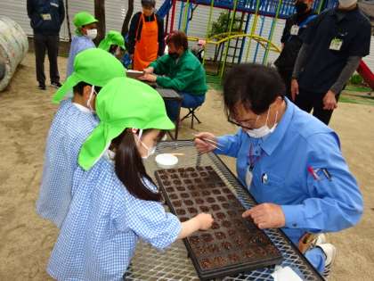 4月15日お花の種をまきました 公開日 2022/04/17 更新日 2022/04/17 お知らせ 中央区役所「種花事業」の方と一緒に、5歳児がジニア(百日草)の種まきをしました。一粒ずつ丁寧にまきました。芽が出るのが楽しみです。 いいね(0)