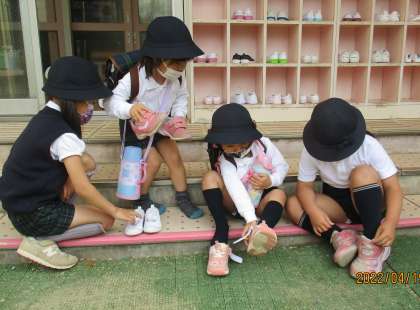 門から手をつないで靴箱まで連れて行ったり、朝や帰りの用意のやり方を教えたり、発育測定の着替えを手伝ったりしています。