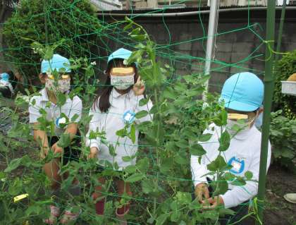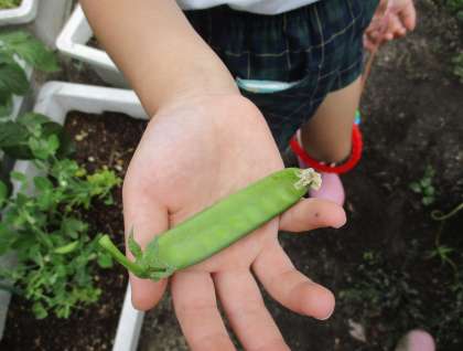 昨年の11月に種をまいたエンドウができ、収穫しました。おうちに持って帰ります。きっとおいしいよ。