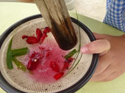 5歳児 花びらをすり鉢とすりこぎでゴリゴリすると、きれいな色が出てきました。