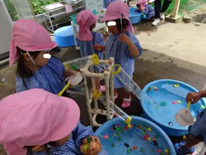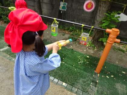 4歳児 水鉄砲の遊びでは、先生がいろいろな的を用意し楽しんでいます。