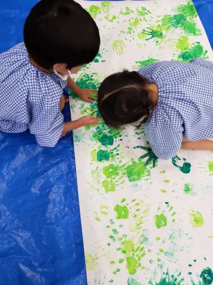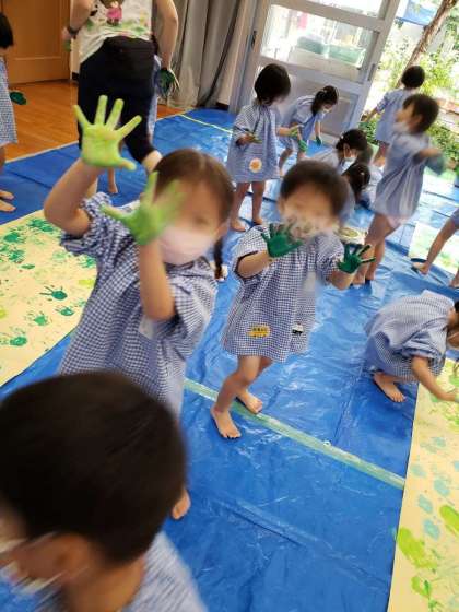 絵の具遊び 3歳児 公開日 2022/07/12 更新日 2022/07/12 お知らせ 今日は雨降りでプールはお休みです。 3歳児は、遊戯室で絵の具遊び。 緑色の手を見て「かえるのみどりちゃんになった!」「気持ちいい!」と、のびのびと楽しんでいました。 いいね(0)