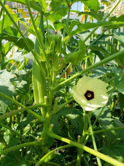 幼稚園の畑に、とても美しいうす黄色の花が咲いています。なんのお花かわかりますか?答えは「オクラ」です。