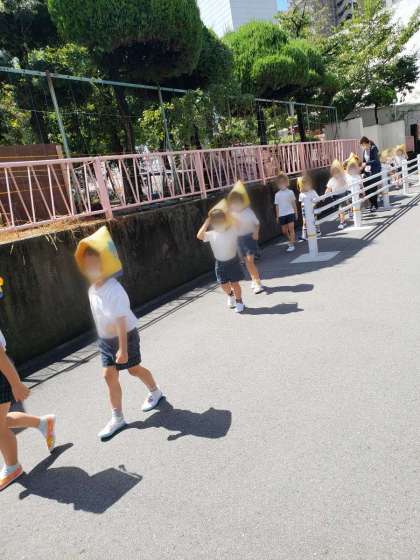 防災頭巾をかぶり、隣の銅座公園まで上手に避難することができました。
