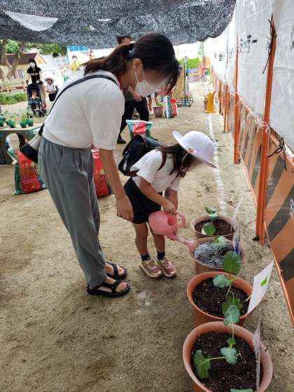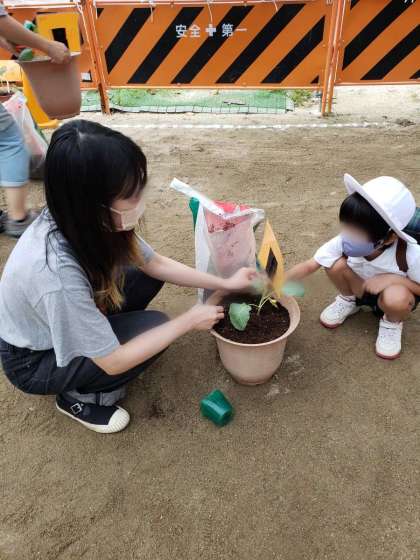 おうちの人と一緒に、ブロッコリーの苗を植えました。